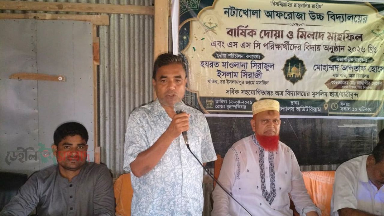 ১৬ ই এপ্রিল বৃহস্পতিবার বেলা ১২ টায় অত্র বিদ্যালয়ের মিলনায়তন রুমে উপজেলা যুবদলের যুগ্ম আহ্বায়ক মোঃ আলতাফ হোসেন এর সভাপতিত্বে নটাখোলা উচ্চ বিদ্যালয়ের প্রধান শিক্ষক জাহাঙ্গীর আলমের শুভেচ্ছান্তে উক্ত দোয়া মাহফিল ও এসএসসি পরীক্ষার্থীদের বিদায় অনুষ্ঠিত হয়েছে। এ সময় প্রধান অতিথি হিসেবে বক্তব্য রাখেন জেলা বিএনপির সাবেক কোষাধ্যক্ষ আব্দুল হক।