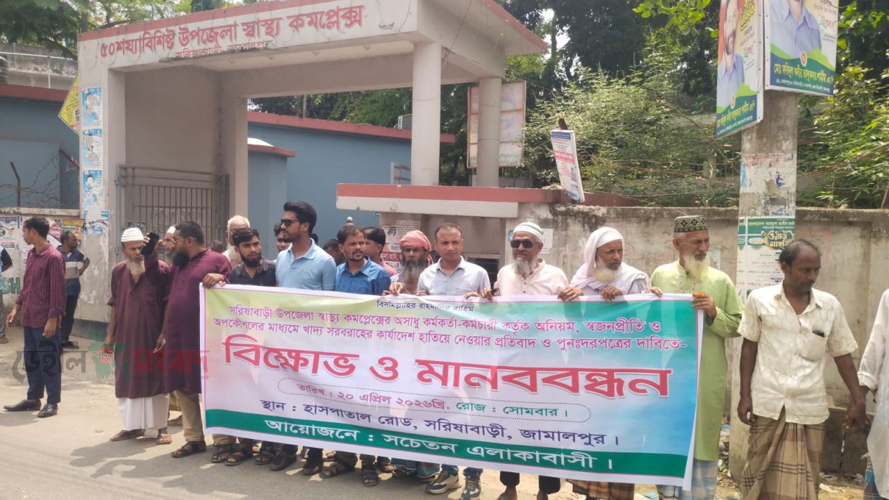 সরিষাবাড়ী ( জামালপুর) প্রতিনিধি: জামালপুরের সরিষাবাড়ী উপজেলা স্বাস্থ্য কমপ্লেক্সে খাদ্য সরবরাহের কার্যাদেশ প্রদানকে ঘিরে অনিয়ম, স্বজনপ্রীতি ও অস্বচ্ছতার গুরুতর অভিযোগ উঠেছে। সর্বনিম্ন দরদাতাকে উপেক্ষা করে অধিক দরদাতা প্রতিষ্ঠানকে কার্যাদেশ দেওয়ার প্রতিবাদে সোমবার (২০ এপ্রিল) হাসপাতাল চত্বরে সচেতন এলাকাবাসীর ব্যানারে মানববন্ধন কর্মসূচি পালন করেছে ।